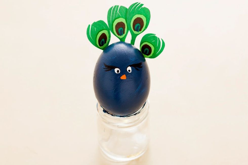 Alright, if you got through the toucan, the peacock will be a breeze! Paint the whole egg navy blue. Next, paint its face — be sure to give it long, luscious lashes and a small triangle nose.