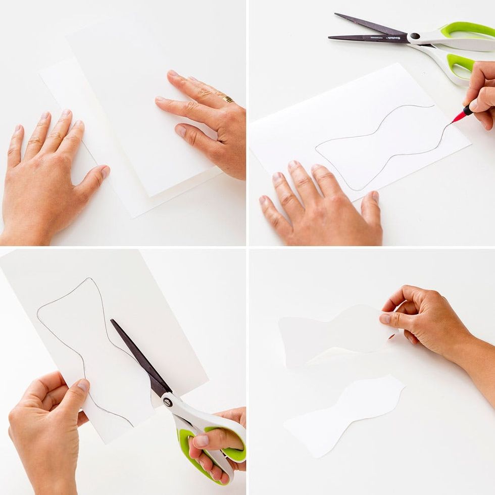 Start by folding your paper in half and then grab your pencil. You’re going to have to draw, which can be intimidating, but we know you can do it! Think about drawing a fish. It’s got a tail and an almond-shaped body. And this fish is going to have a funny little nose. Do fish even have noses? It’s more of a nose-mouth-beard-chin. A muzzle, if you will. Your fish (or paper bow tie we’ll call it) should be about six inches long. Cut out your paper bow tie. You should have two identical pieces.