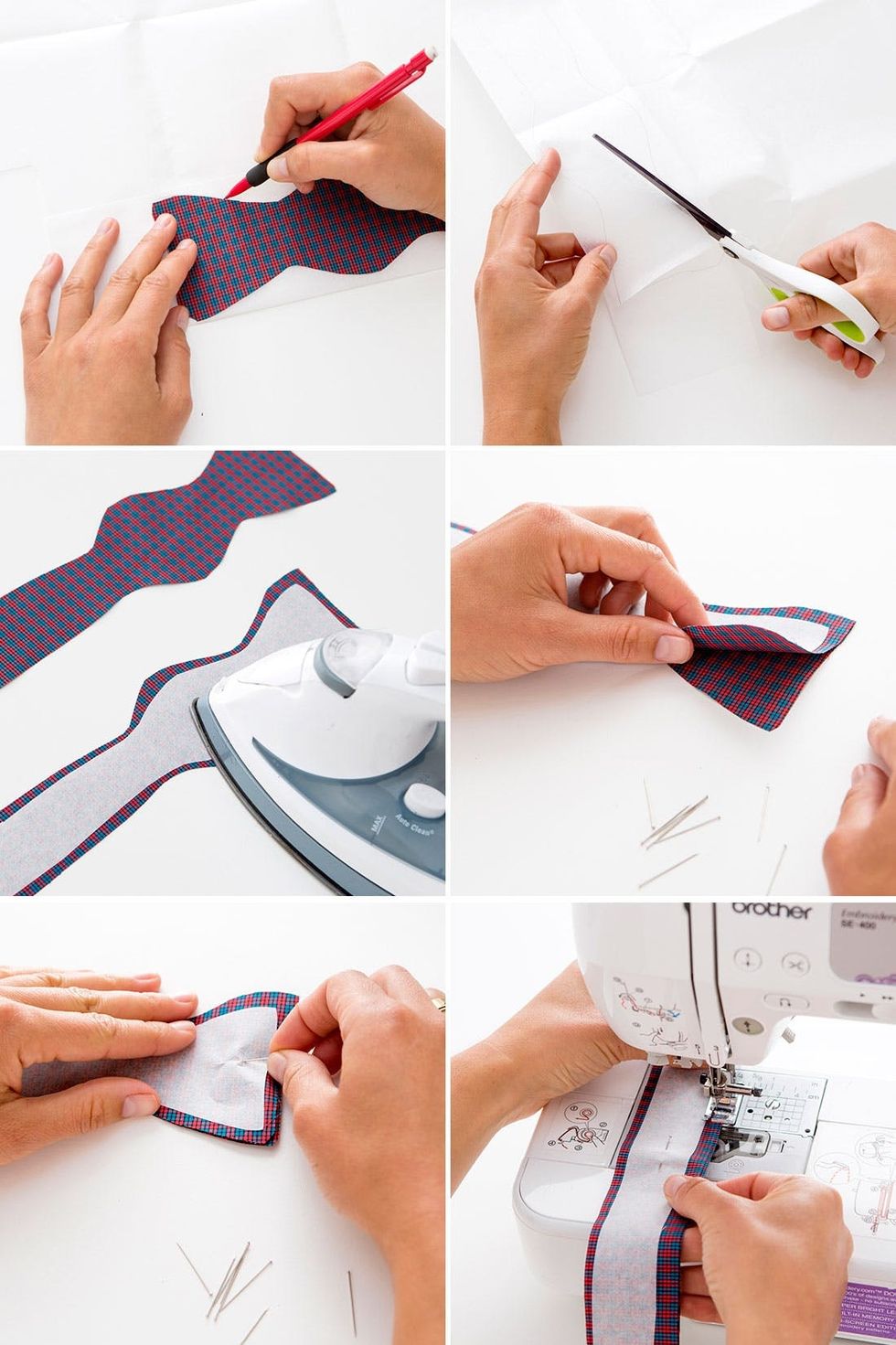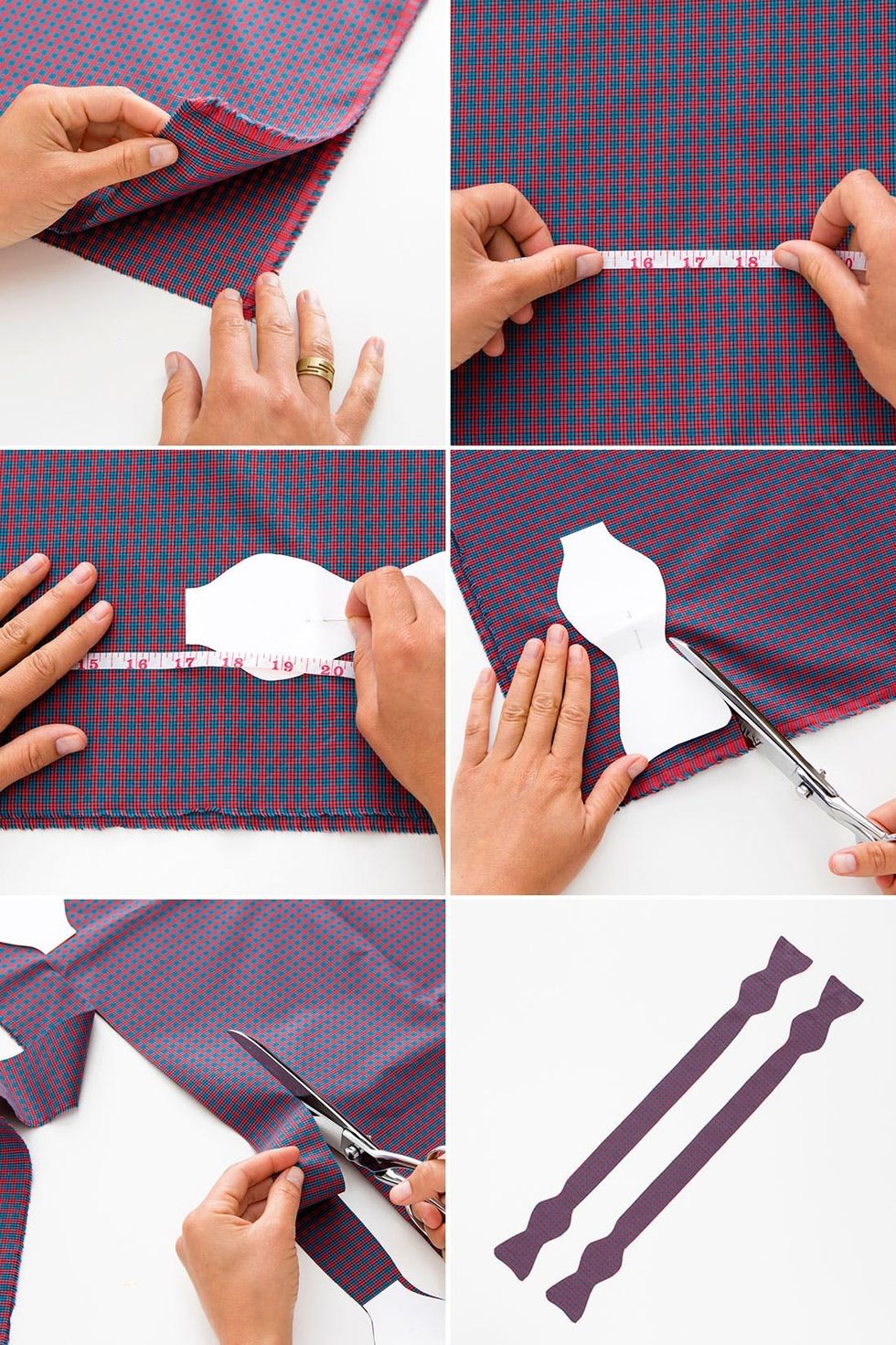 Fold your fabric in half and then measure your dad’s neck measurement on the fabric, leaving at least six inches on each end. Pin your paper bow ties to the ends of your measurement (there will be one pinned at 1 inch and one pinned at 17 inches). Cut around the paper bow ties and along the strip in between the two. Think of it like this — your two fish should be connected by a long piece of spaghetti, Lady and the Tramp style. Separate your fabric and you should have two identical bow ties.