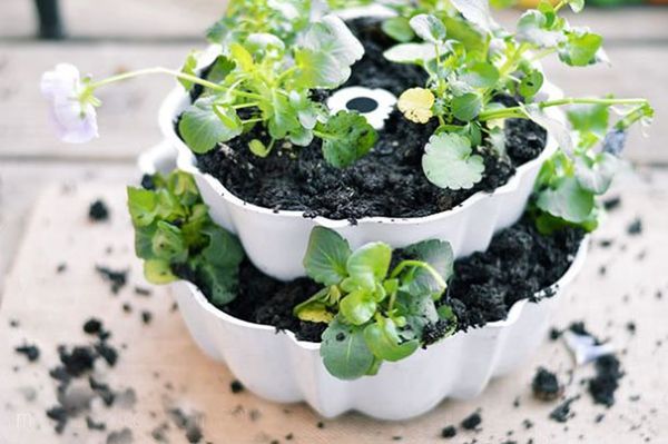 7. Two-Tiered Bunt Planter: Tiered displays aren’t exclusive to pastries. Create a tower of garden goodness using old cake bunt pans as planters. (via Hometalk)