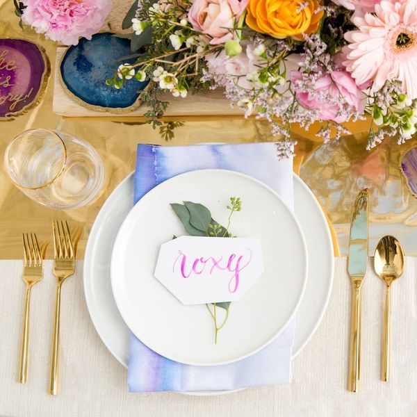 We’ve got wedding fever here at Brit + Co, and we’re looking for any and all possible ways to DIY your own wedding decor! When you’re decorating on a budget, versatility is key to saving time and money, so investing in a new creative skill is definitely in your best interest. In this tutorial we’ll show you how to amp up your table signage and place card game with Brush Calligraphy skills, and how to remix our DIY Agate Coaster Kit to create fun, decorative accents.
