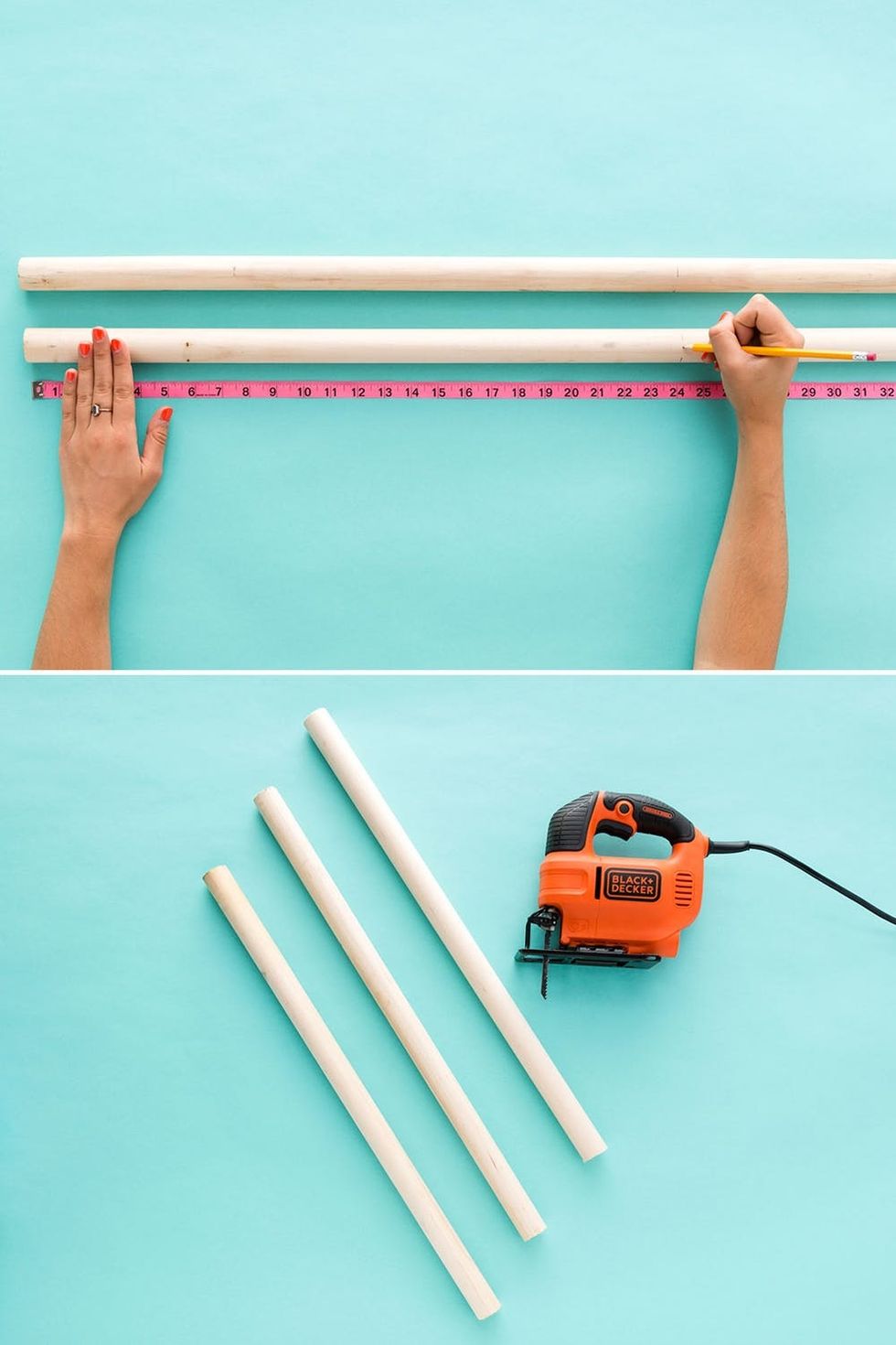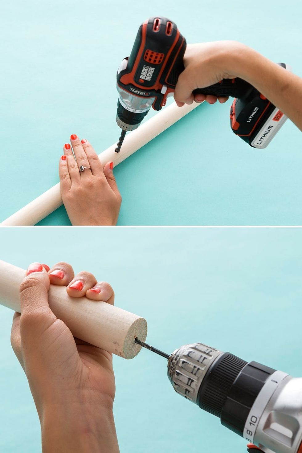 Measure 10.5 inches from the top of the dowel and drill a hole all the way through. We used a 5/16th drill bit. Using a smaller drill bit, drill a hole in the center of the top of the dowel. Drill about one inch down. Drill holes through and in all three dowels.