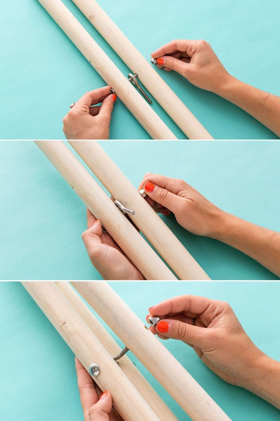 Slide the three-inch bolt through one of the dowels, thread on the eye-hole bolt and a second dowel, then secure together by screwing on an acorn bolt. Attach the last dowel by placing it on the eye-hole bolt and tightening with an acorn nut.
