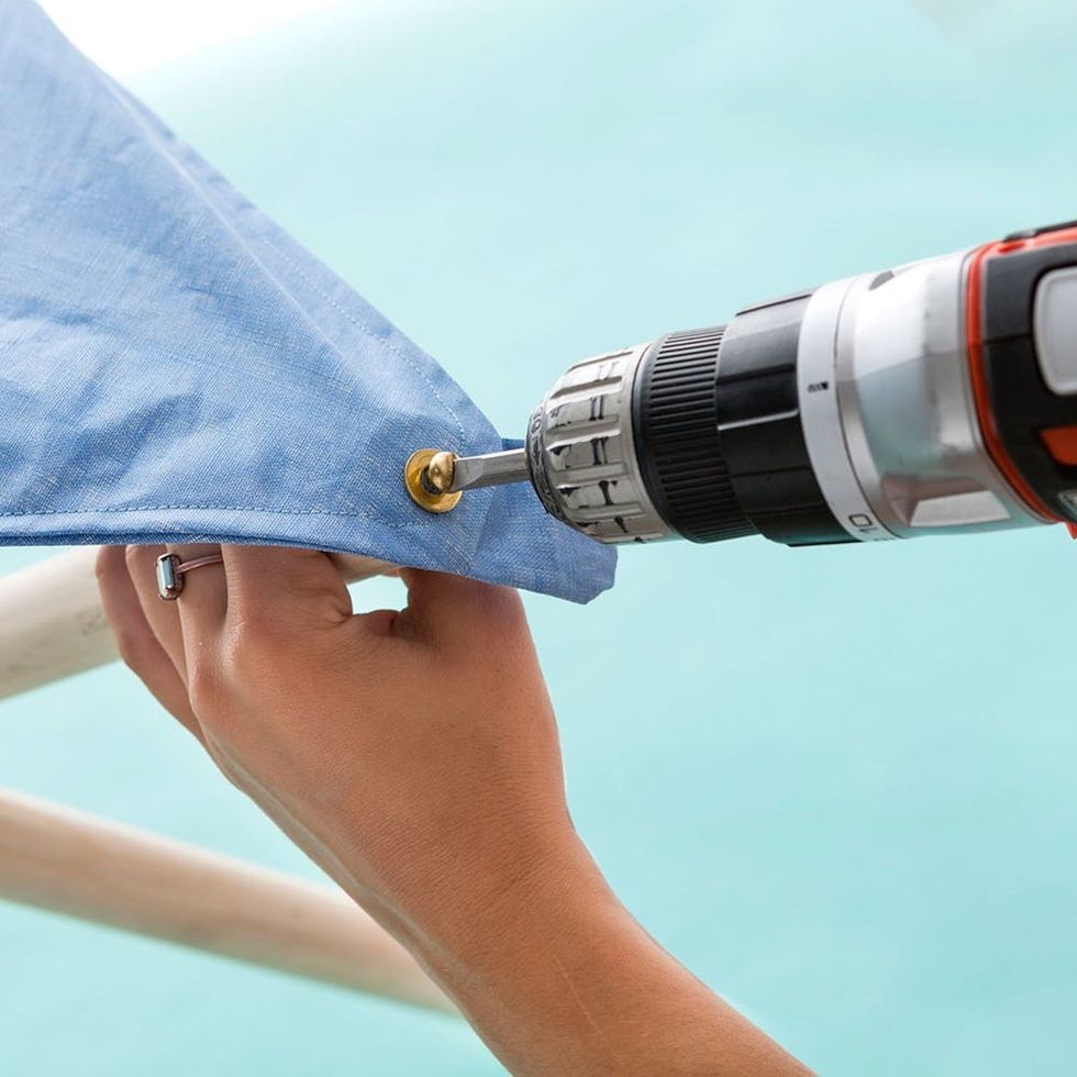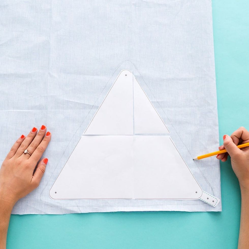Time to create the seat. You’ll want to purchase waterproof or water-resistant canvas. To create the seat bottom, we used Wood & Faulk’s template and traced around it with an inch buffer. Fold the fabric in half to create two cut-outs.