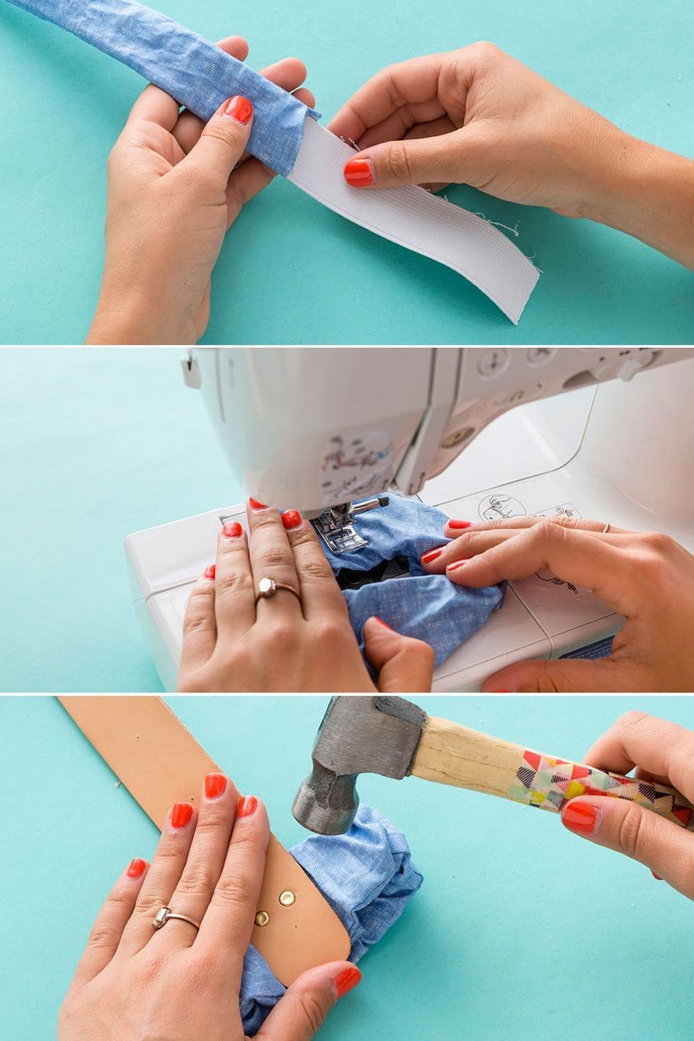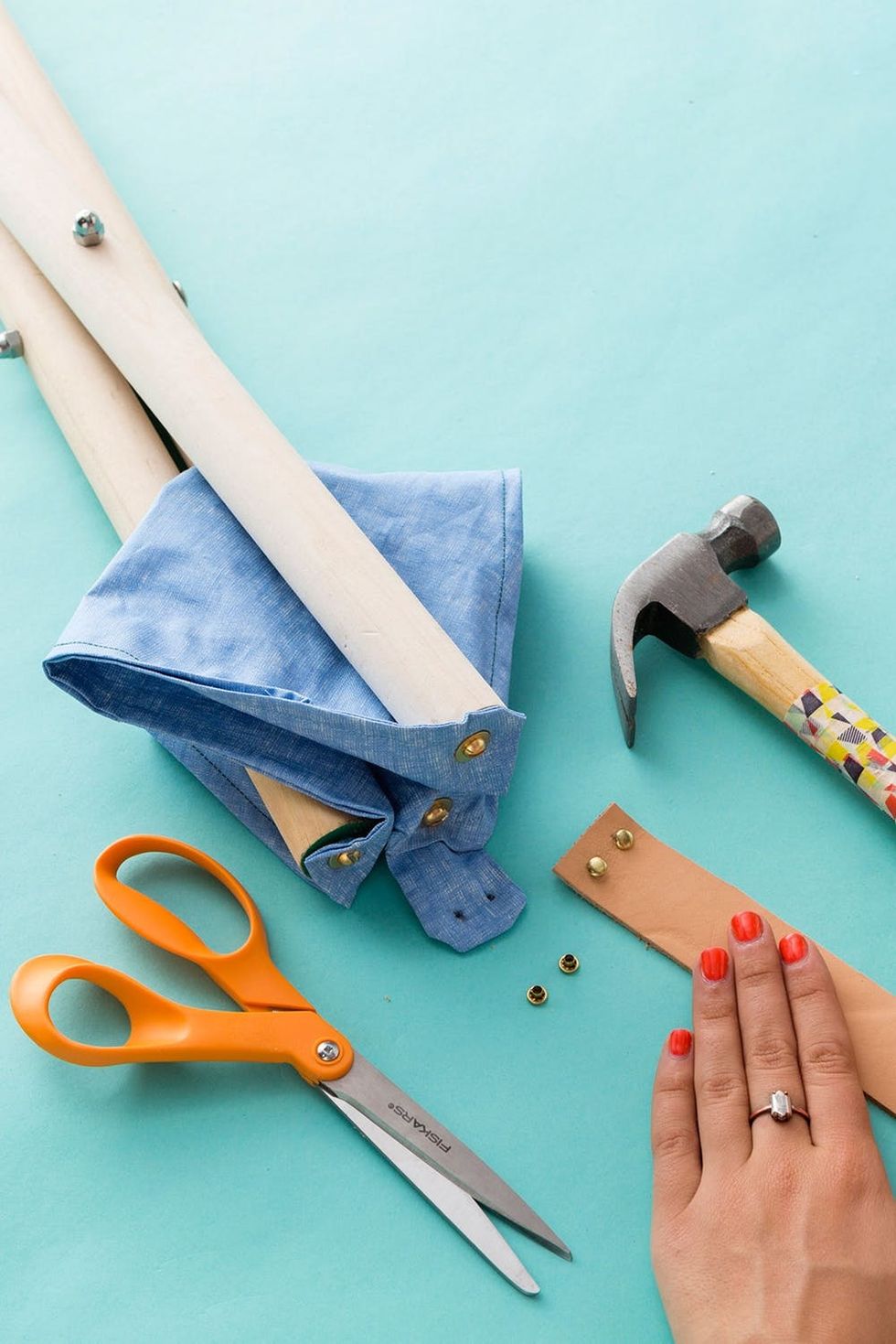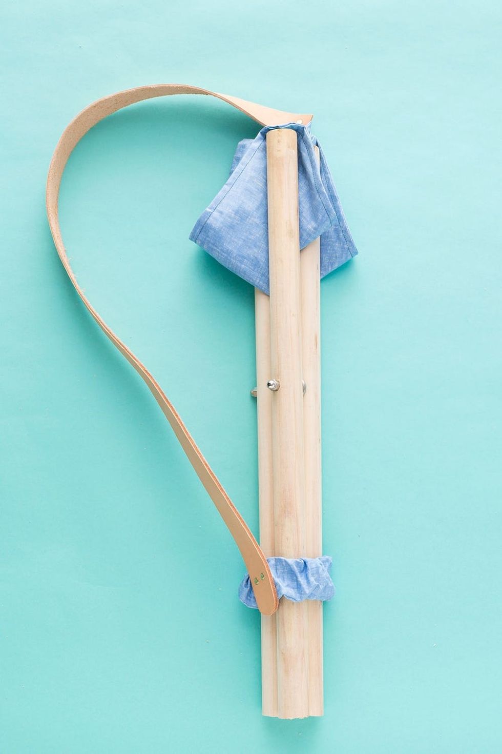 Place all the dowels of the stool together and measure the circumference. Cut out this length from elastic. Sew together a tube for the elastic — your fabric tube should be twice as long as the elastic. Feed the elastic through and then sew together to form a circular band. Attach to one end of the leather strap using two rivets.