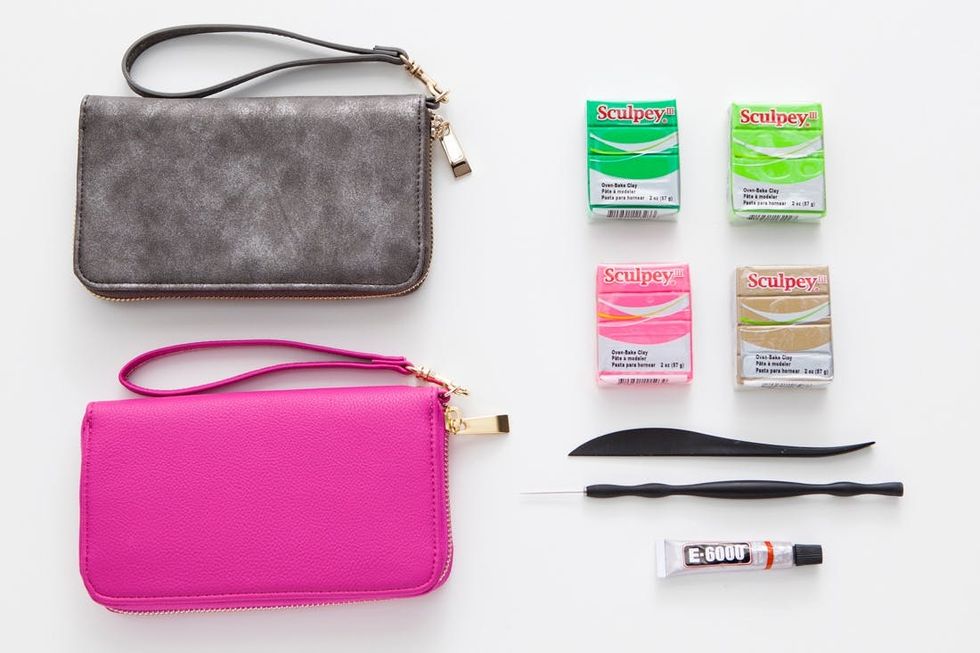 Have some fun picking out your clay and clutches—we scored these wristlets at Target, but you could always update an oldie you have on hand. We decided on a bright color palette for both, ‘casue with all this gloomy weather, we wanted a clutch that would really a pop! Even though we made three versions, the process for each is the same. So choose your favorite shape and let’s get going.