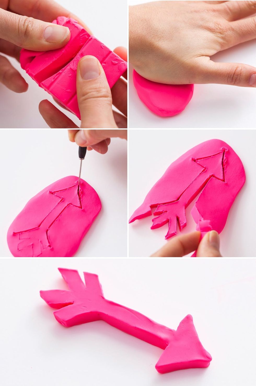 Now, grab your needle tip clay tool (be careful, it’s sharp!). This tool is great because you can draw and cut with it. First, draw your design lightly on the clay. If you mess up, smooth it out with your finger and start over. Once you have a shape you like, carve it out by slicing through the clay with your needle tool. Pull away the excess clay and then smooth out the edges. If you’re making this for Valentine’s Day, you could make the tip of the arrow a heart and win some mega cute points ;)
