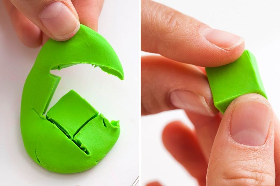 Finally, we’re going to make some little squares. Repeat the steps from above but this time, we’re gonna add some more colors into the mix—a gold square and another shade of green. They kind of remind us of Rubik’s Cube squares or buttons from a space ship in an ’80s movie, which is just fine by us!