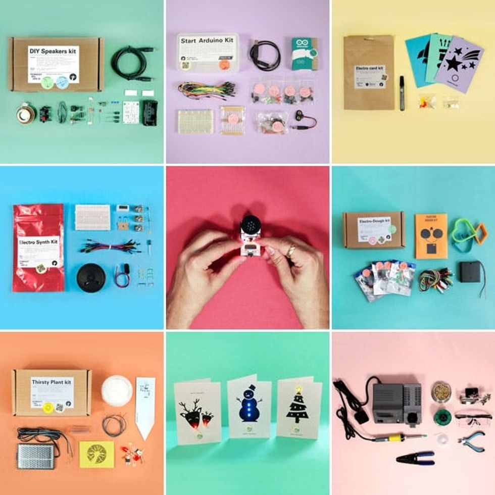 We also love the Electro Card Kits ($20) which come with bare conductive paint (a multipurpose electrically conductive materials), 6 LED’s, 3 button cell batteries, and a selection of festive designs for card-making. No wires necessary!