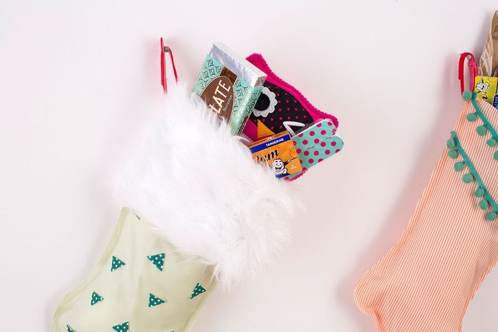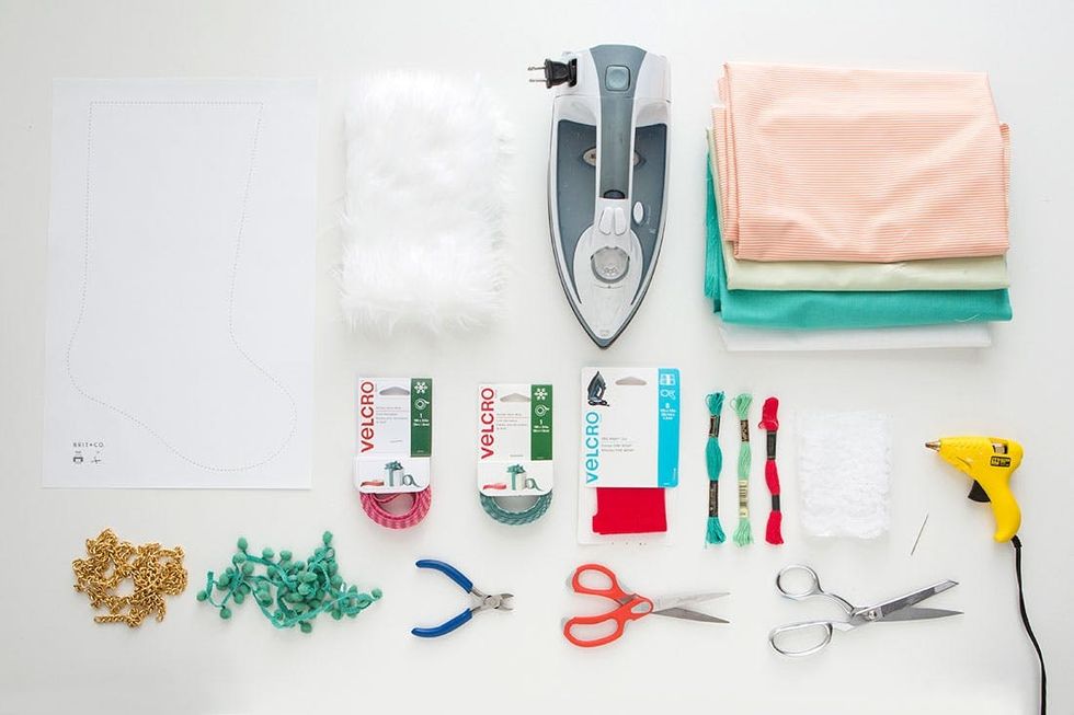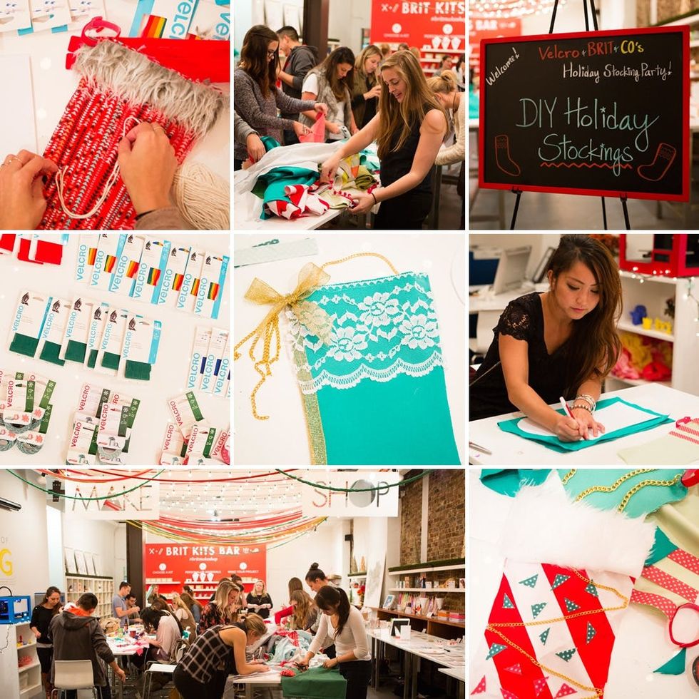 The leaves have fallen and the gourds are out, which means the holidays are on their way. And we all know what that means. It’s time to start thinking about holiday decor. Today we’ve combined forces with our friends at Velcro Industries to create holiday stockings that you can easily hang over the fireplace with VELCRO® Brand Holiday Decor Wraps. We even hosted an event right here at Brit + Co and invited all of our friends to come make these gorgeous stockings with us! :)