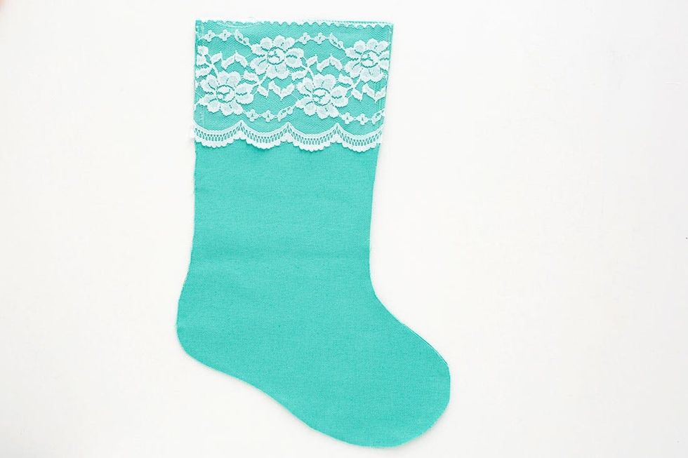 Place the lace on top of the stocking and cut a piece to size. Use hot glue to attach it.