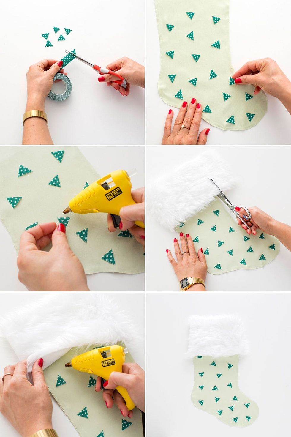 Cut out small triangles and then glue them to your stocking. Cut out a piece of fur to add to the top and glue it in place.
