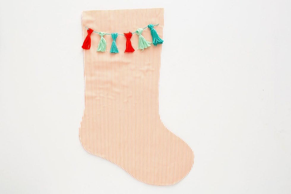 To add them to your stocking, thread the tassels onto a piece of embroidery floss and then stitch it onto the stocking. We simply tied a knot on the inside of the stocking to keep it clean.