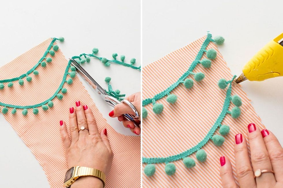 All you need to do is cut your pom poms at the length you desire and glue them in place. Easy peasy.