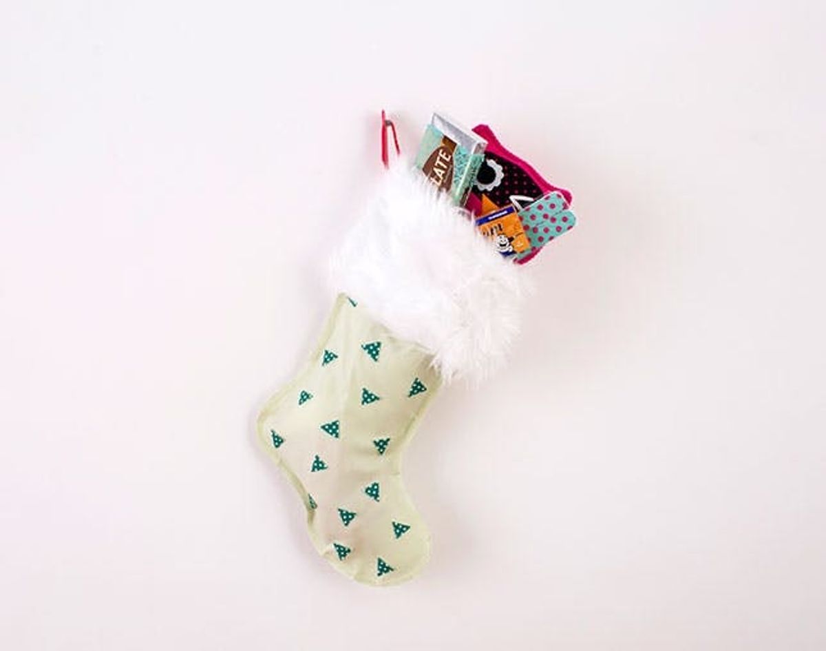 To add them to your stocking, thread the tassels onto a piece of embroidery floss and then stitch it onto the stocking. We simply tied a knot on the inside of the stocking to keep it clean.