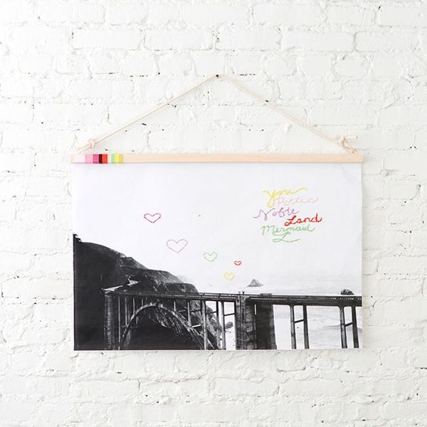 We are all about gift giving here at Brit + Co, especially ones we can customize for all the amazingly different personalities in our lives! This is a super fun Valentine’s Day gift that can hang all year long — and it’s affordable to boot! The secret — or maybe not so secret — is a Kinko’s hack: large scale engineer prints. These inexpensive prints can be printed right on the spot and cost about $5-$7. We dressed ours up by embroidering our favorite words and made a simple Balsa wood and rope fixture to hang it on the wall.