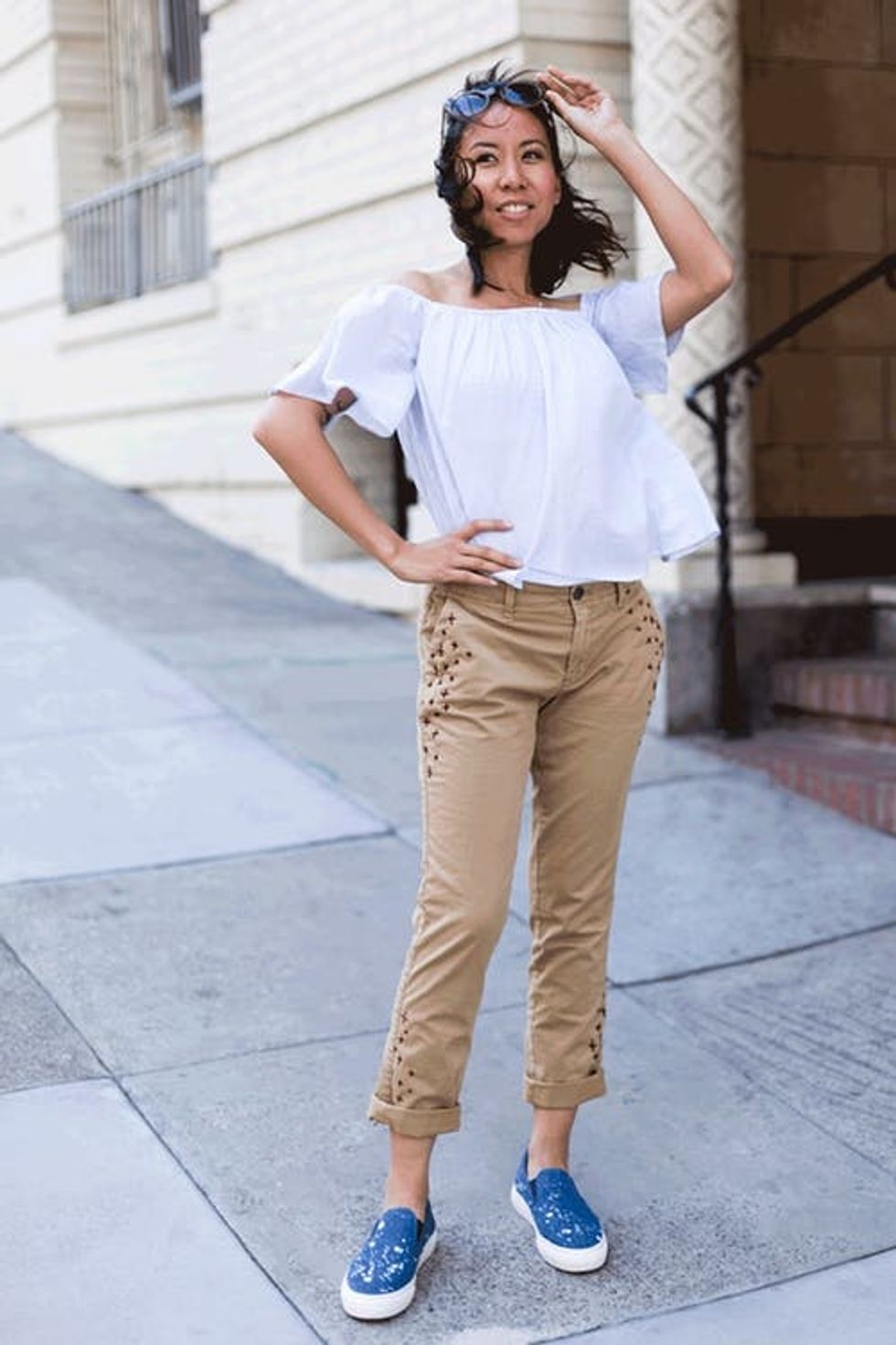 Style your updated khakis with an off-the-shoulder top to really make this outfit on trend with spring 2017 style.