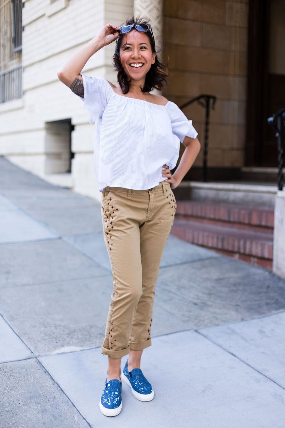 Like Lolly’s look? Get it here: Express Off-the-Shoulder Top ($50), Gap Girlfriend Twill Stripe Chinos ($60), Gap Denim Slip-on Sneakers ($45)
