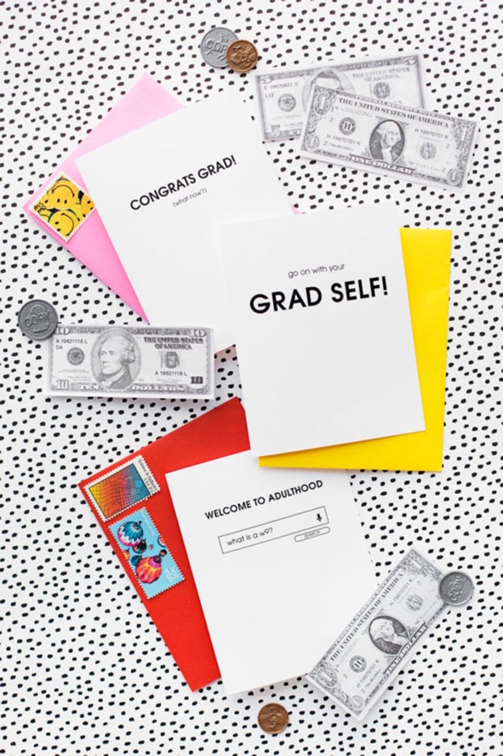 32. Printable Welcome to Adulthood Cards: They thought university was hard? Just wait until they figure out that ignorance isn’t an excuse. Set them up for a night out when things get rough, or help contribute to their first month’s rent with these cards. (via Studio DIY)