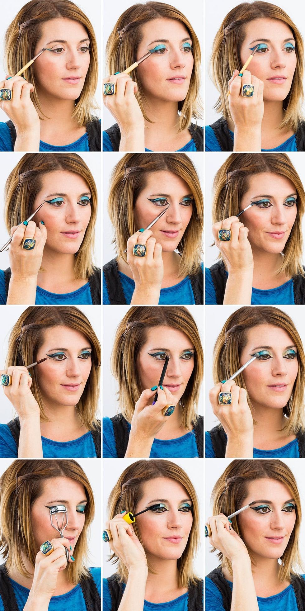 2. Now take a flat shadow brush and fill in your eyelid with a shimmery bright teal shadow like Peace from Urban Decay’s Deluxe Eyeshadow Palette ($23). Blend it right up to the edge of the line you made for the cat eye.
