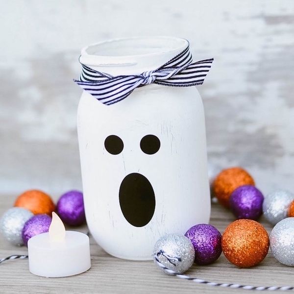 15. Mason Jar Ghost Lantern: Give your home a bright but spooky look by creating your very own surprised ghost vase. Add a pop of color with a cute ribbon trim or a festive Halloween-themed garland. (via Simply Kierste)