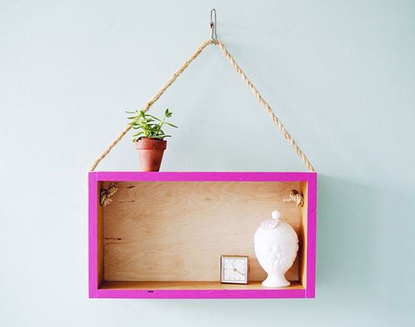 Fun and functional are words that totally go together in the world of home storage. But with this DIY hanging shelf, you might also want to add fast and frugal to the list. That’s because we’re turning a basic box into statement shelving using only durable rope and a standard drill. Not so scary, right? Though we wouldn’t call it complete until it’s tricked out with a bright pop of color :) Plus, the entire transformation only takes five steps — that’s fairy godmother-paced turn around time And just when you thought it couldn’t get any easier… it does: there’s no level required to mount this modern shelving unit! Just hang the rope handle onto a single hook and call it a day. It’s a perfect storage solution for renters and dorm-dwellers worried about adding one too many holes in the wall, or even fickle homeowners who change up their decor often.