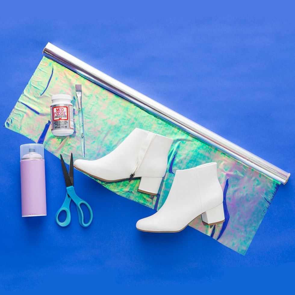 Have you ever dreamt up a perfect shoe that doesn’t exist? FYI, that is pretty much my life. I always want the style of the high-heeled boot but with no heel, or the cute sneaker with no laces — I search and search, but of course that shoe doesn’t seem to exist. Flash forward to this month, and here at Brit HQ we are all abuzz about holographic everything. We searched high and low for cute holographic booties for festival season and just never found the pair that suits our style. But when this happens, we have one solution — head to our craft table and make our own :) Follow along below or tune into the video to find out how.