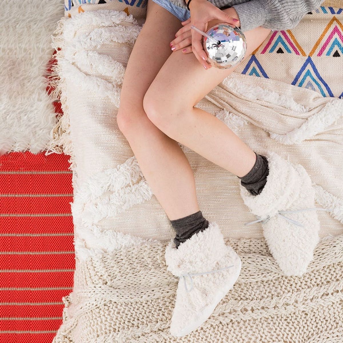 Real Talk: My toes are ALWAYS cold. I’ll wear two pairs of socks and somehow, my toes will still be cold! So basically, this DIY idea came from 1. my feet always being cold 2. seeing the slippers my sister received from the holidays and then 3. finding the super cozy fabric that my sister’s slippers were made out of. These DIY slippers are pretty much just huge, cozy envelopes to keep your feet warm. They’re the perfect addition to any sweat pant outfit that is of course accompanied with snacks (maybe a boozy breakfast cocktail out of a disco ball travel mug) and hours of Netflix.