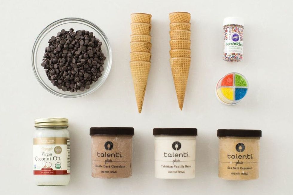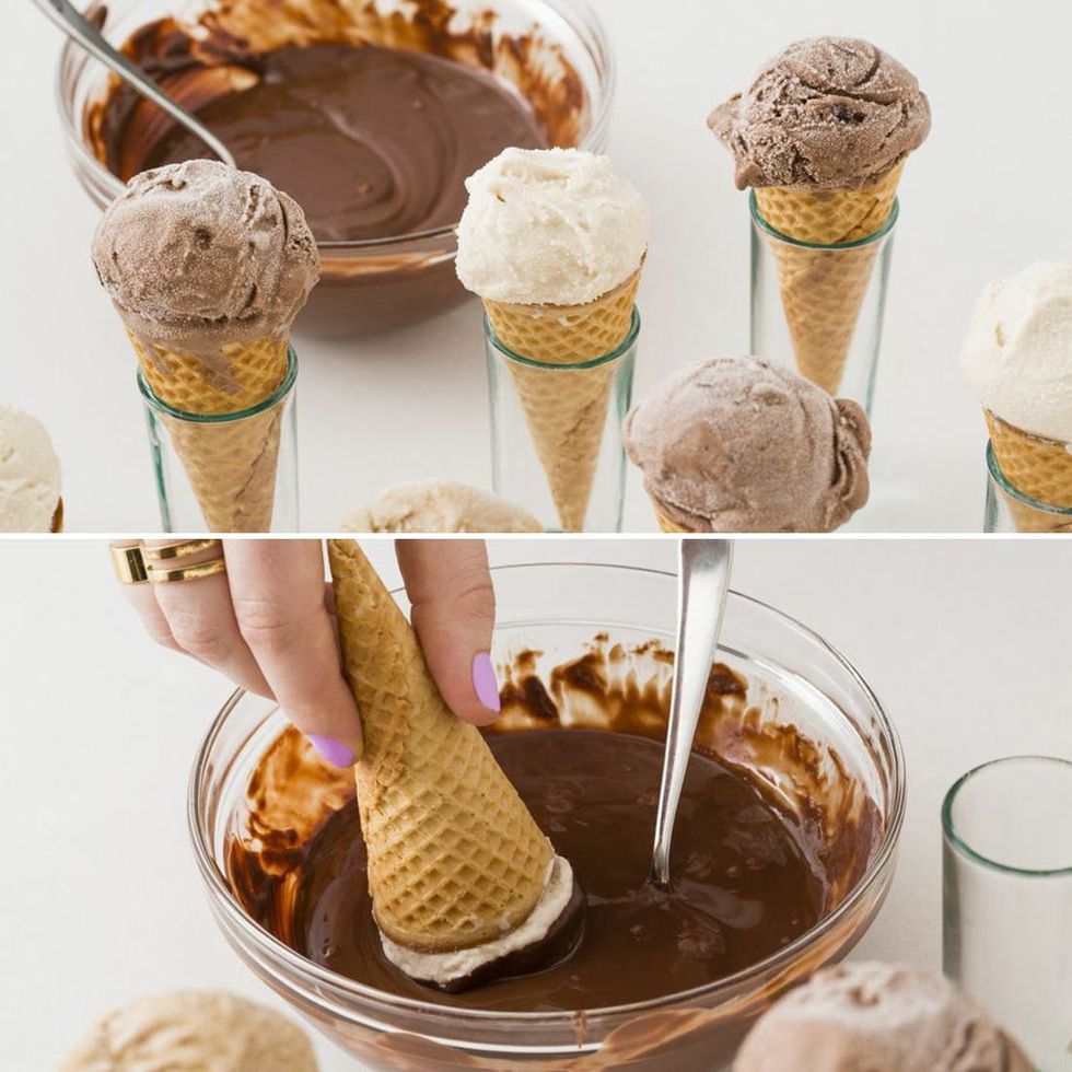 - Remove ice cream from the freezer to soften. Set your sugar cones upright in shot glasses. Drizzle 1 to 2 teaspoons of melted chocolate into each cone. Place cones in the freezer for five minutes to let the chocolate harden.