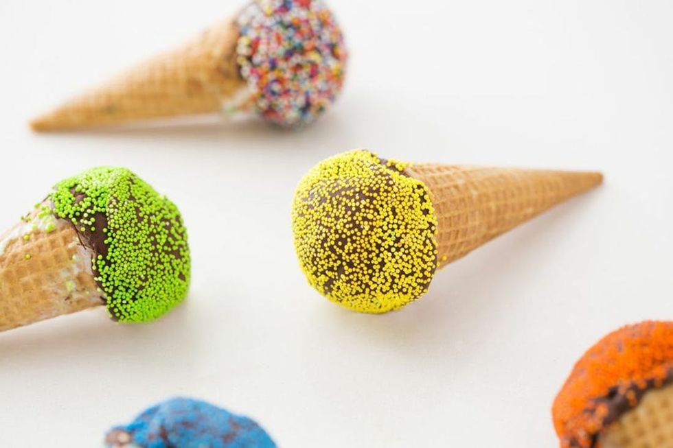 - Remove the ice cream cones from the freezer. Working quickly, dip each cone in melted chocolate and top with sprinkles. Freeze for 15 minutes. Enjoy!