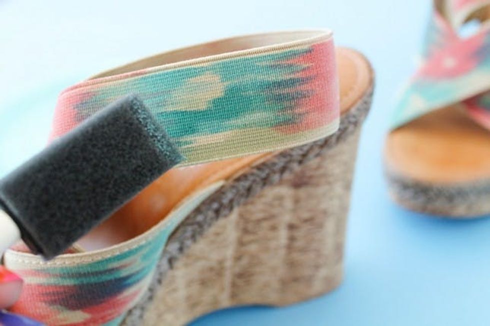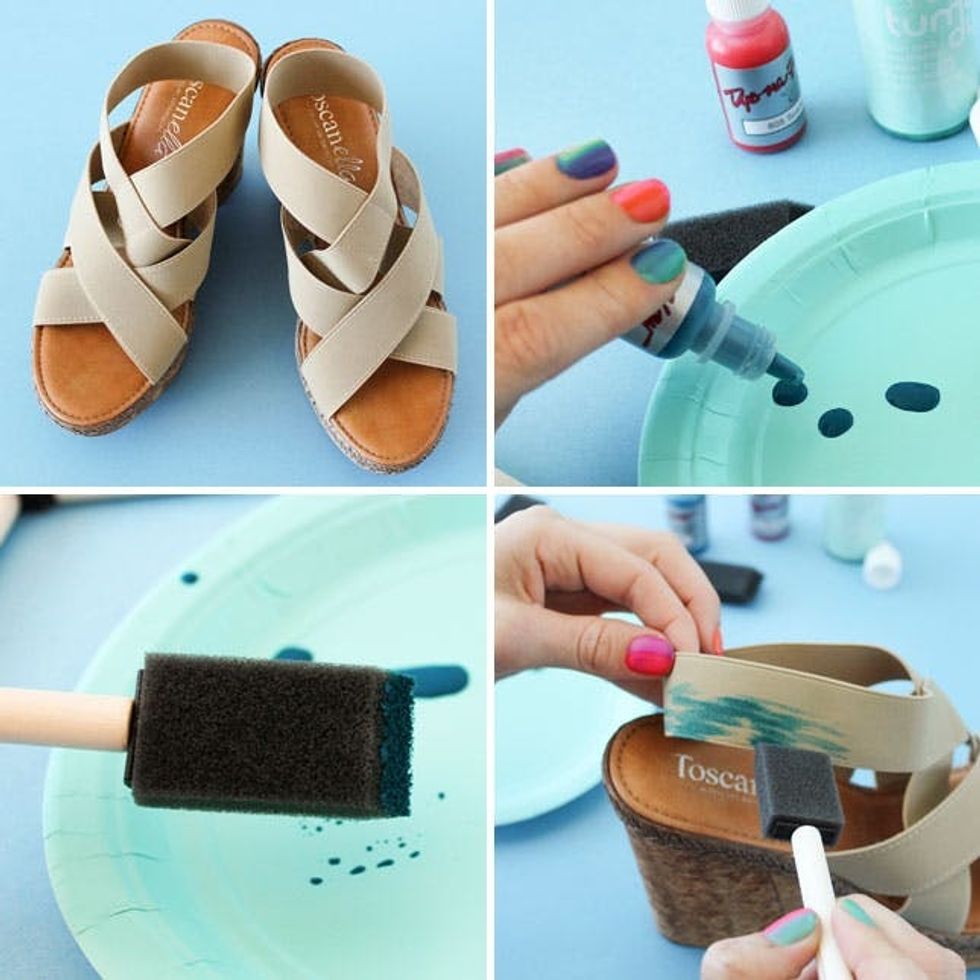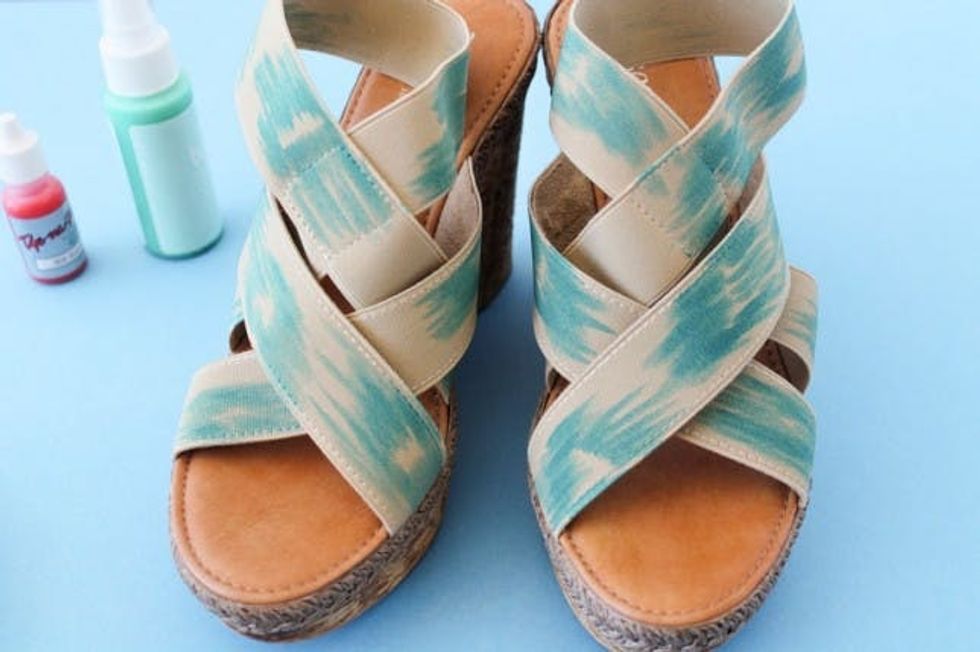 Zappos. This is also a great way to update old wedges or heels. The fabric dyes we used are leftovers from our Dyed Scarves Brit Kit! We used SEI Tumble Dye in Mint and DyeNaFlow dye in Azure and Brick.