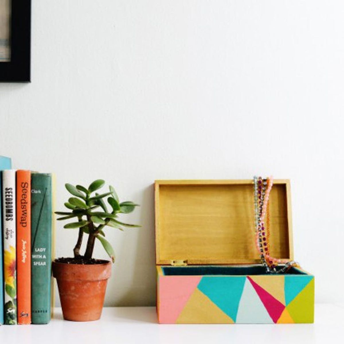 Organizing all your bling isn’t the easiest of tasks to master. At least if you don’t have the right kind of storage, it’s not. But we’ve got the fix — this modern and colorful jewelry box that will house your jewels and brighten up your dresser. Upgrade a simple wooden box with paint, felt, a few pieces of balsa wood and a little creativity. Not feeling the triangular pattern? Go for stripes or a simple color block. Follow these simple instructions to DIY your own.