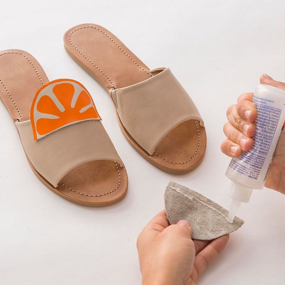 Use Fabri-tac to glue the orange slices onto the top edge of the sandal.