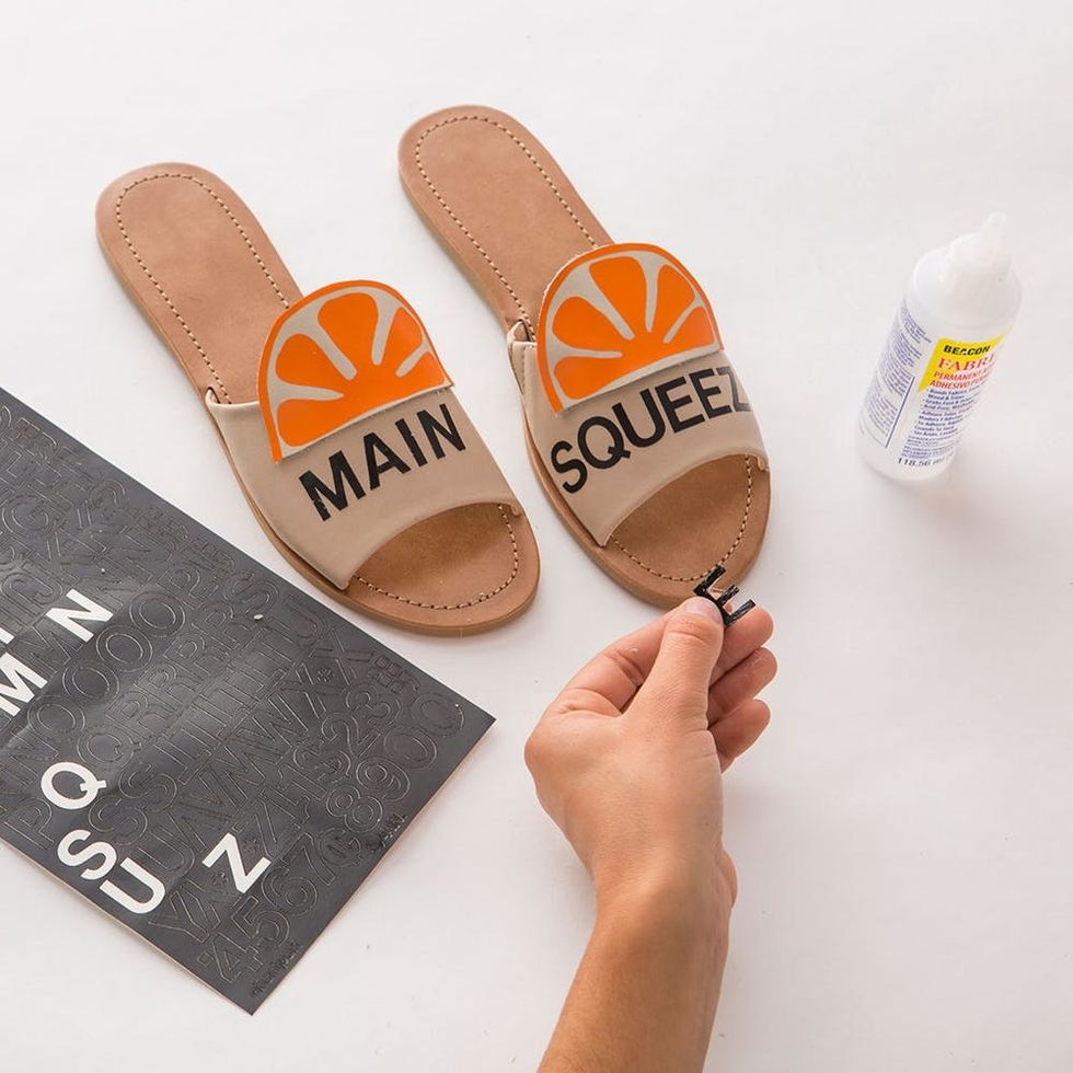 Spell out “main squeeze” on the two sandals — use Fabri-tac to glue down the vinyl stickers.