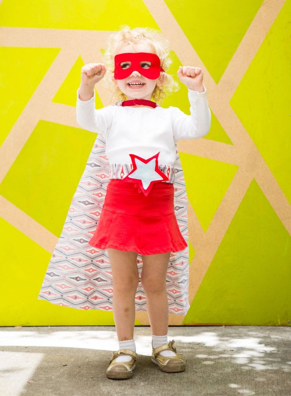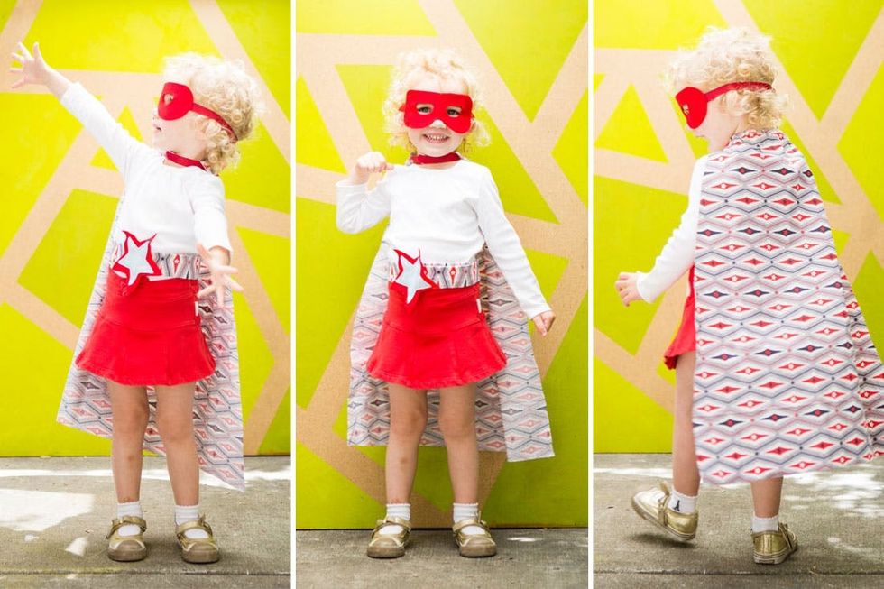 Who says you have to go totally cheesy when dressing your tot up this Halloween? With just one yard of fabric and a few pieces of felt, you can easily turn her into the most stylish superhero in town. And the smallest one ;) We teamed up with Velcro Industries and JoAnn Fabrics to create this easy last-minute Halloween costume, perfect for mini fashionistas.