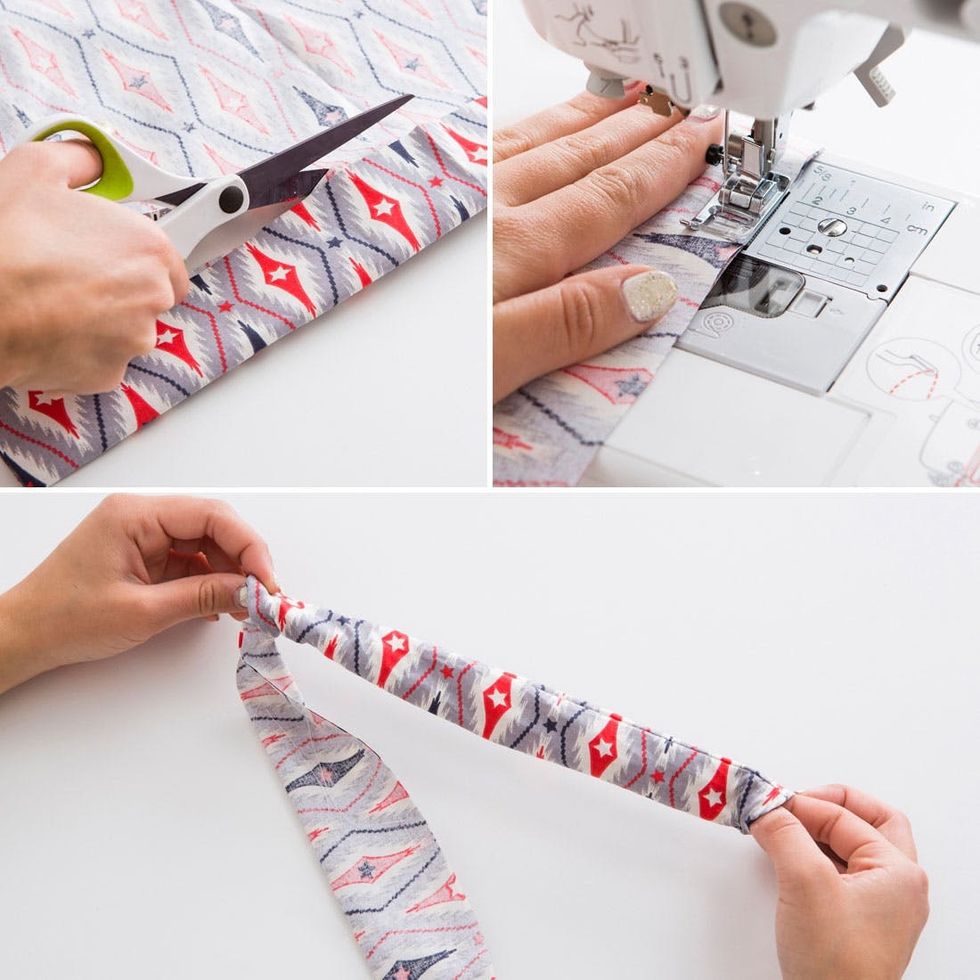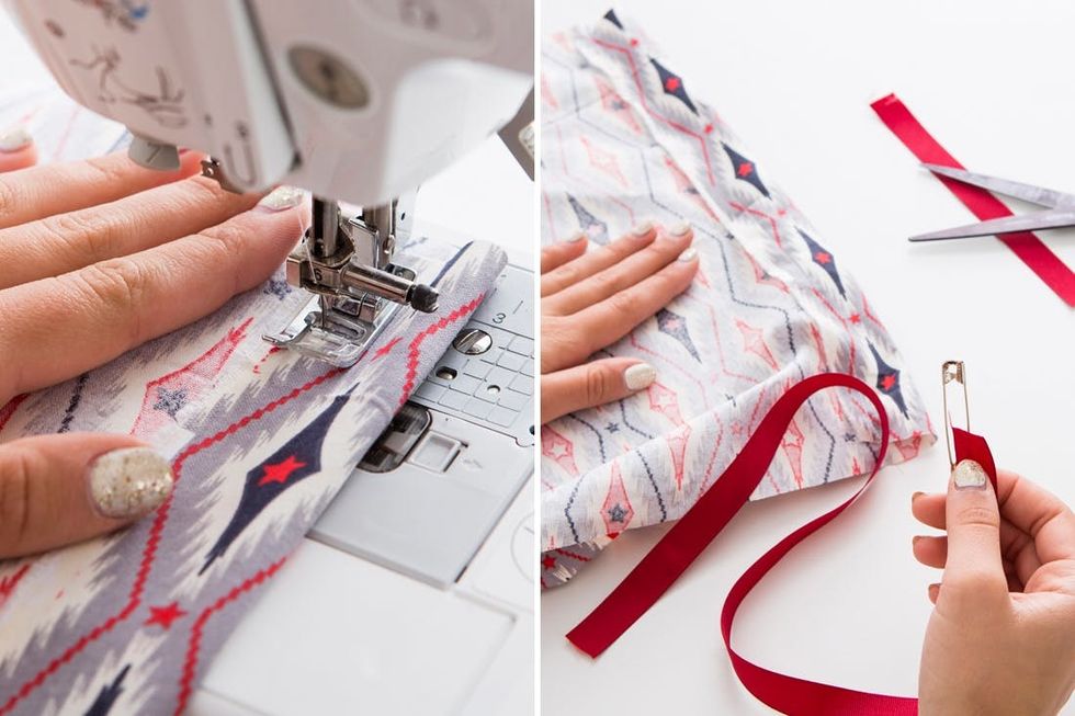 2. Measure your child’s head and cut a piece of ribbon to that length. Use a sewing machine to attach to mask.