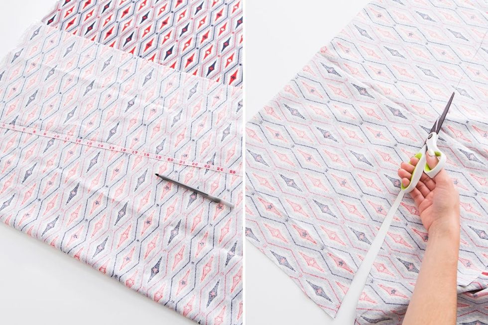 First step is to fold your fabric in half. Our little one had shoulder measurements of 9 inches so we measured 5 inches across the top and 10 inches across the bottom. We wanted the cap to hit right below her knees so our measurement on the fold was about 24 inches. Connect all these measurements with a diagonal line and cut out of the fabric.