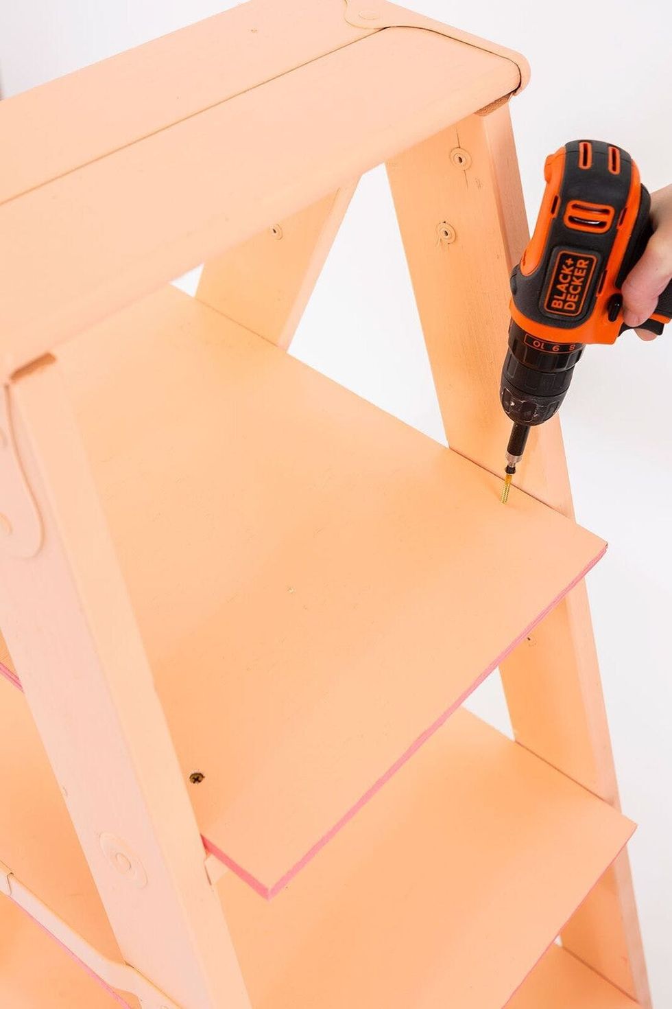 Place the first plywood shelf on the top step. Push a wood screw into each corner of the step.