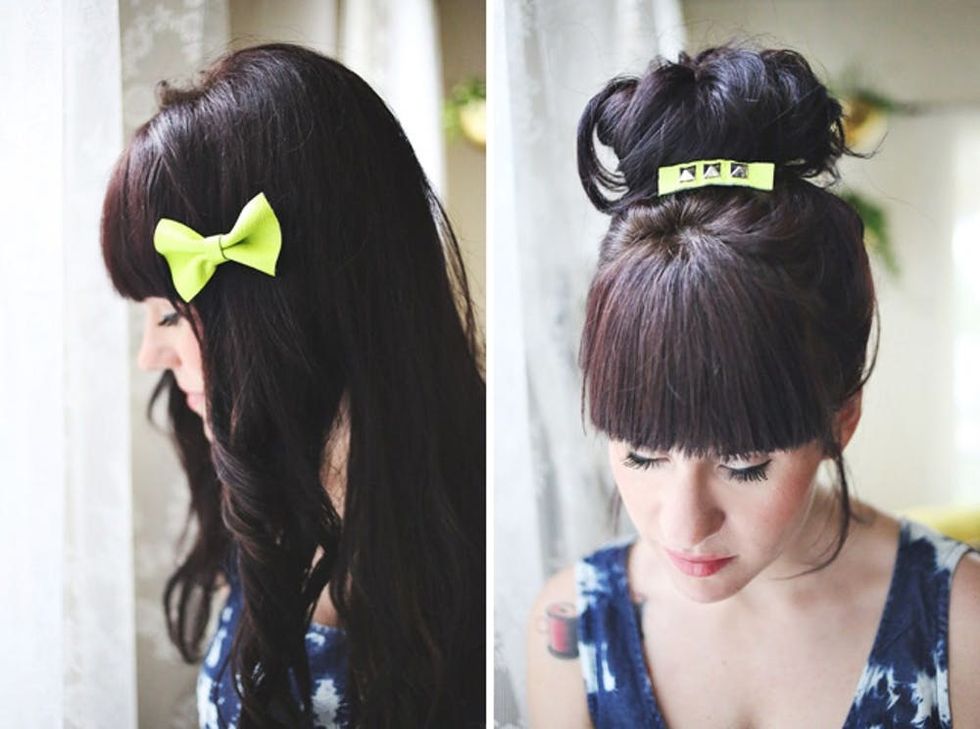3. Hair Clips: Combining the neon trend with the leather one, these add a little bit of contemporary edge to the girly hair bow. (via A Beautiful Mess)
