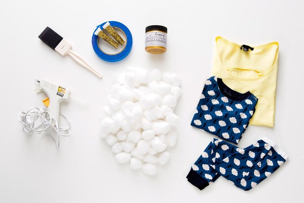 1. Start with the thunder. Use hot glue to attach cotton balls to a pair of navy or gray cotton pajamas or a onesie.