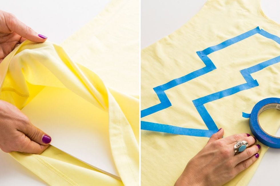 Since you’ll be painting your dress, you want to start by sliding a piece of cardboard or poster board into your dress. Then use painter’s tape to create a lightning bolt shape.