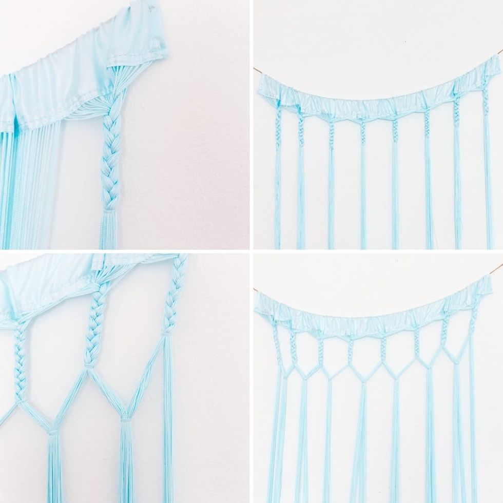 At this point it’s time to start creating the “macrame effect”: Split your curtain’s fringe into eight sections. Braid the first section for four inches and tie a knot, then repeat with the other sections. Now start from the left and split each section in half. Join each half with the half on the right and tie a knot as shown below. Then repeat one more time to create a new layer.