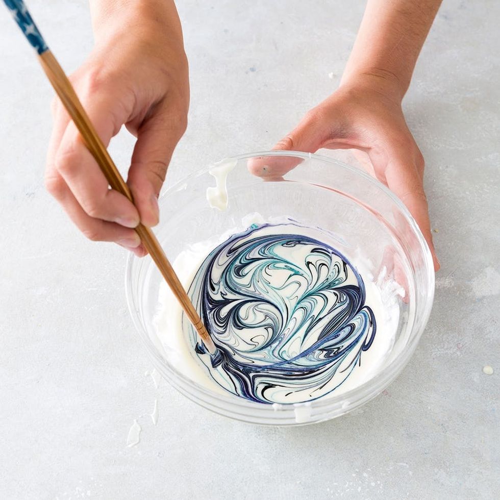 - Once the chocolate is melted, add a few drops of food coloring and stir five times to create colorful swirls.