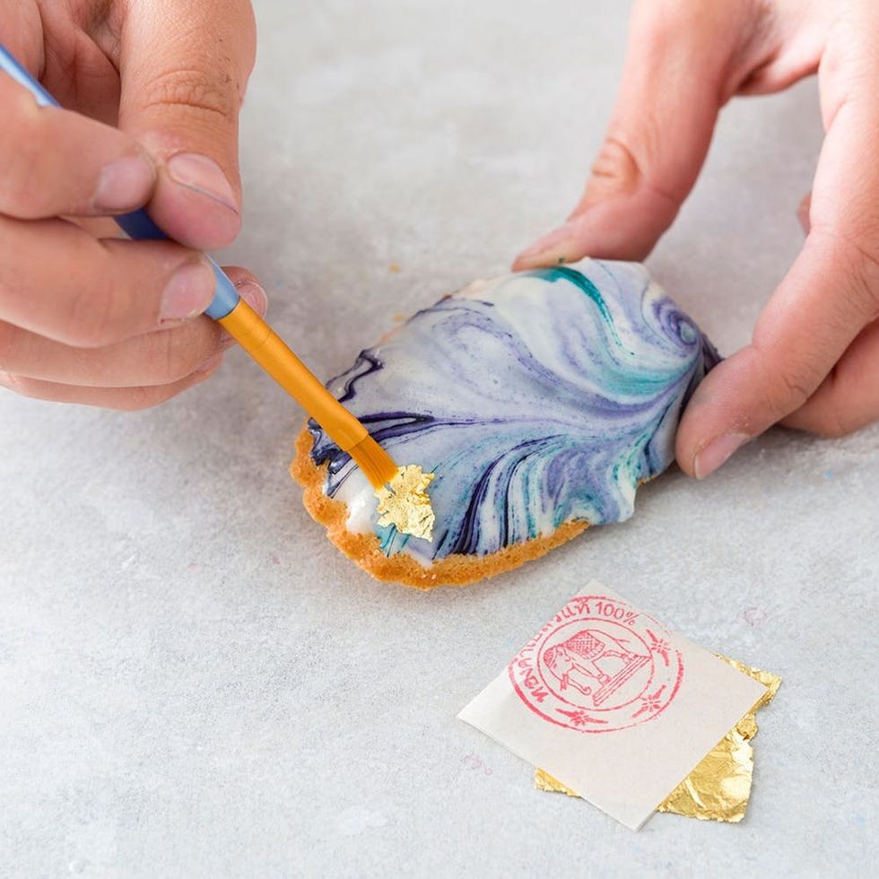 Once the chocolate has hardened, use a paint brush to apply gold foil to the icing.