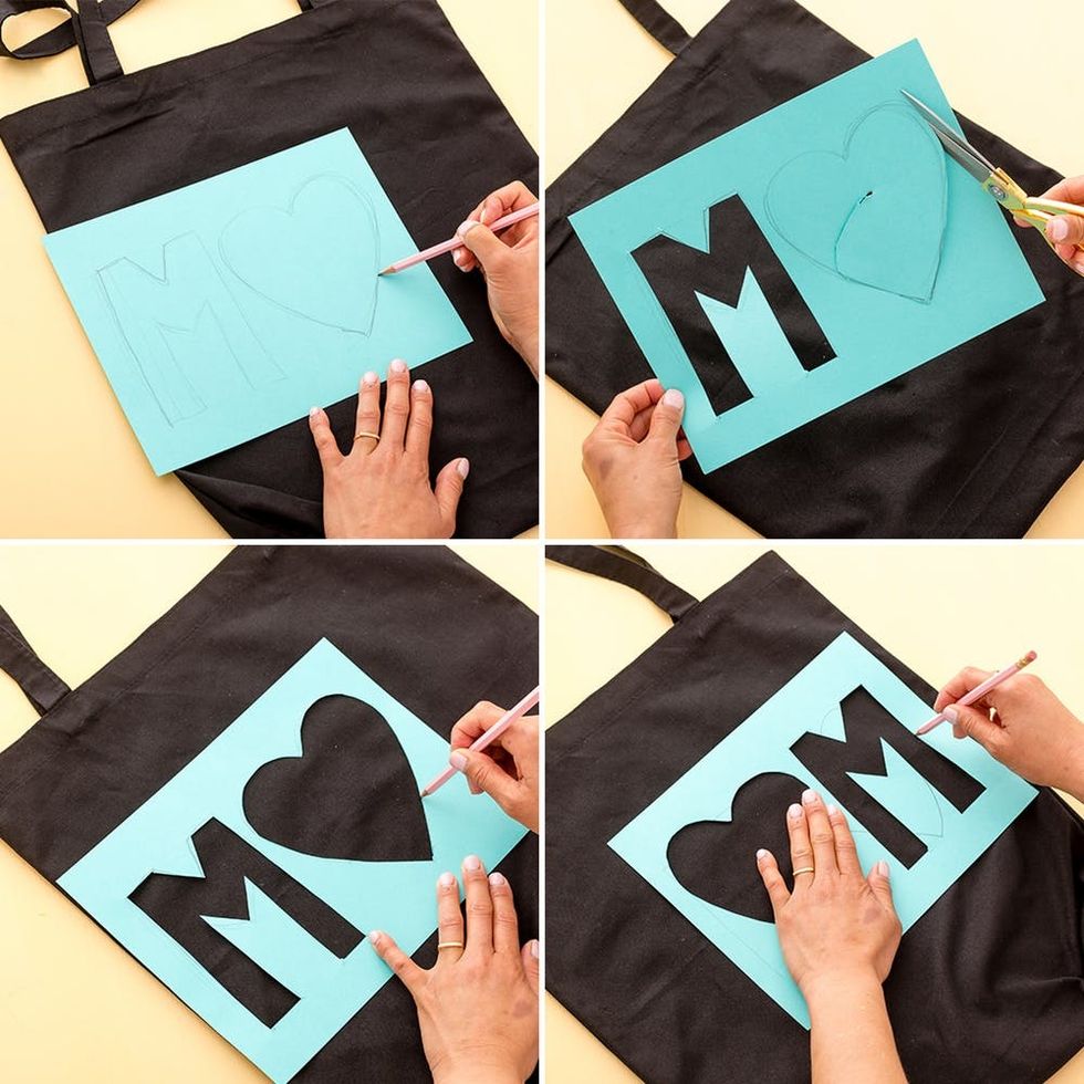 Create your own stencil with cardstock and trace it onto your tote. I made an M-heart-M stencil. Since the tote is bigger than the paper AND mom is a palindrome, you only have to make the M and the heart, then flip it.