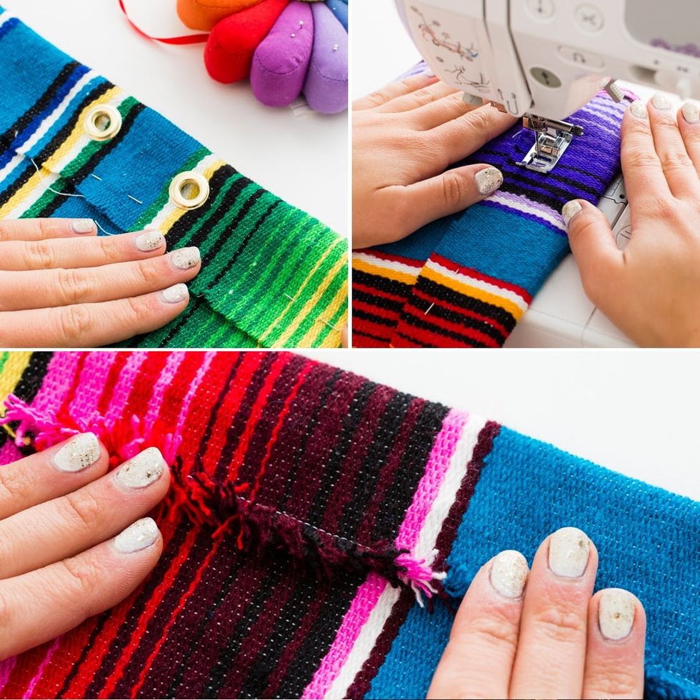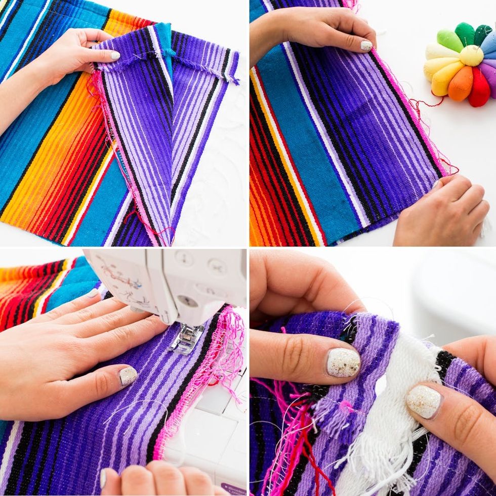 Fold fabric down to create a two inch seam. Pin and sew. Fringe the rough edge to add some flair!