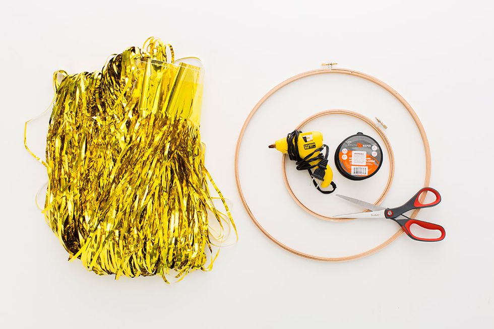 Separate the two sections of the embroidery hoop and then hot glue the gold fringe to the inner hoop. Complete this step on both sizes of hoop. Trim the fringe to your desired length. The smaller hoop will sit inside the larger hoop so you will want the larger one to have a longer layer of fringe.