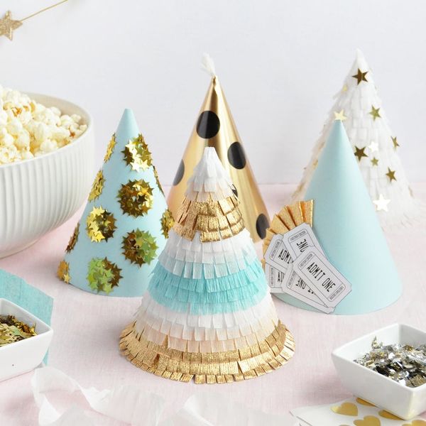 - If not already assembled, use tape to secure the edges of the decorated party hats.