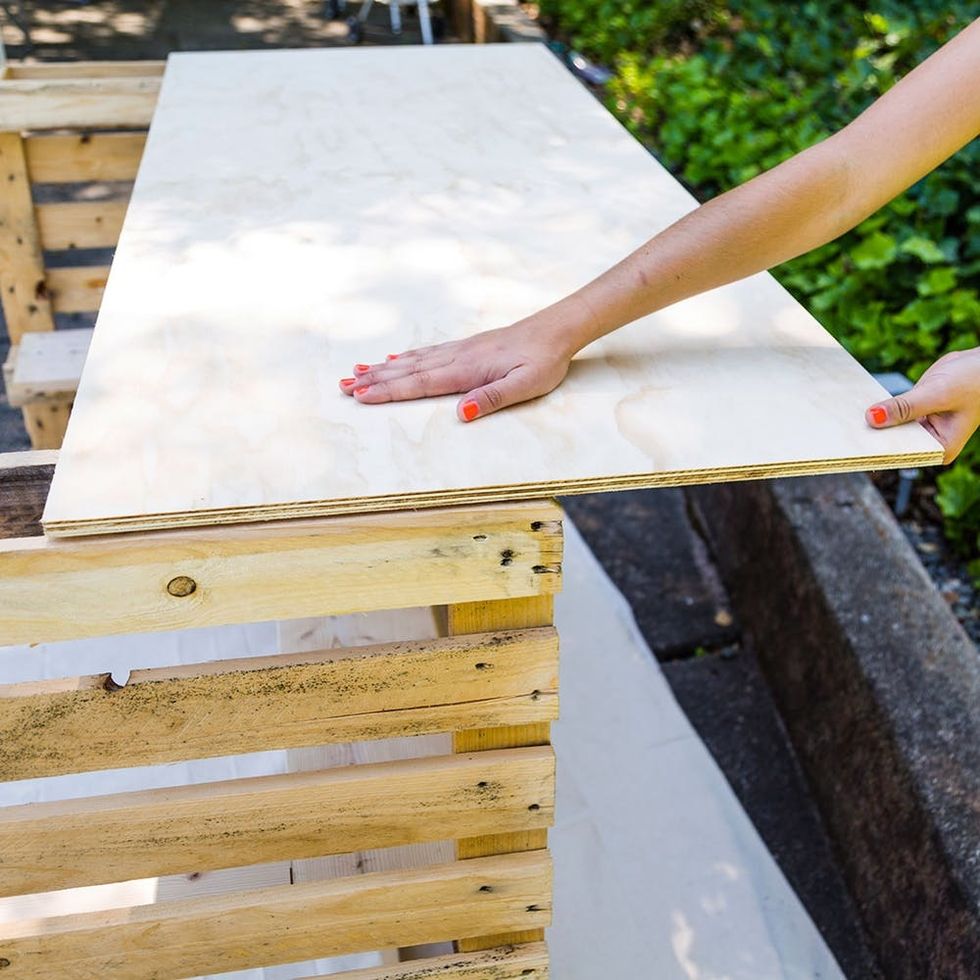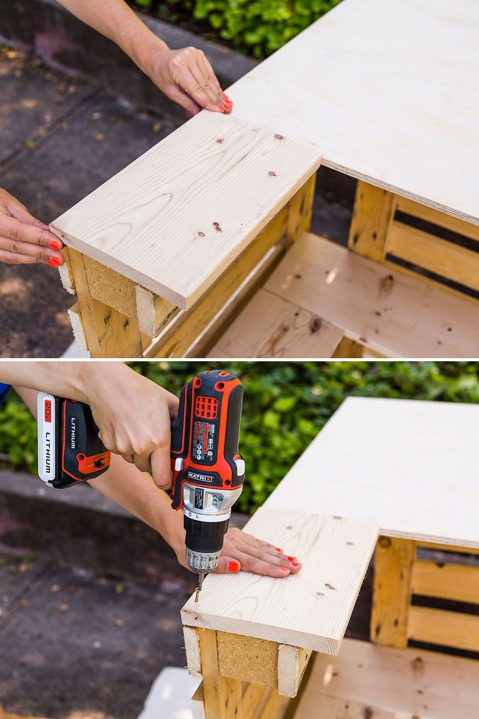 Place the 11.5-inch boards on the top of the pallets to finish off building the bar. Screw in place with 1.5-inch screws.