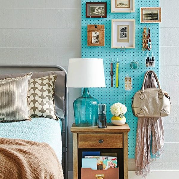 4. As a Side Table: Maybe you’re short on bedroom space and don’t have a side table, or maybe you do have a side table but you still need extra storage. A pegboard can be a fun and unexpected way to bring in vertical storage. Turn it into a piece of art by adding plants and a few framed photos, and hanging your pretty bling from hooks. (via Better Homes and Gardens)